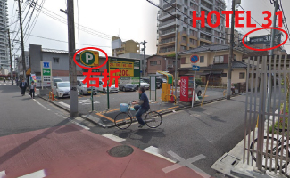 右手にある三井のリパーク(コインパーキング)を右折。HOTEL 31の看板が見えます。