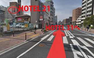 高架下をくぐったら左手にHOTEL 21。HOTEL 31へ向かう場合は、さらに140m程先にある信号の交差点までそのまま道なりに進んでください。