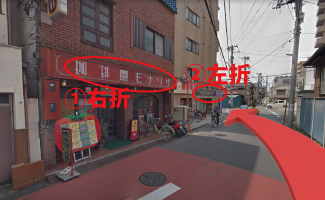細い道を80m程進んだ先の突き当たりに喫茶店があったら、①そのT字路を右折。20m程先で②十字路左の角にあるデンタルクリニックを今度は左折。