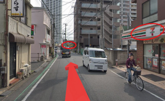 右手にセブンイレブンさんがあったら、さらに30m程直進。画像矢印の先にある赤丸の三井のリパーク(コインパーキング)方向へ向かう。